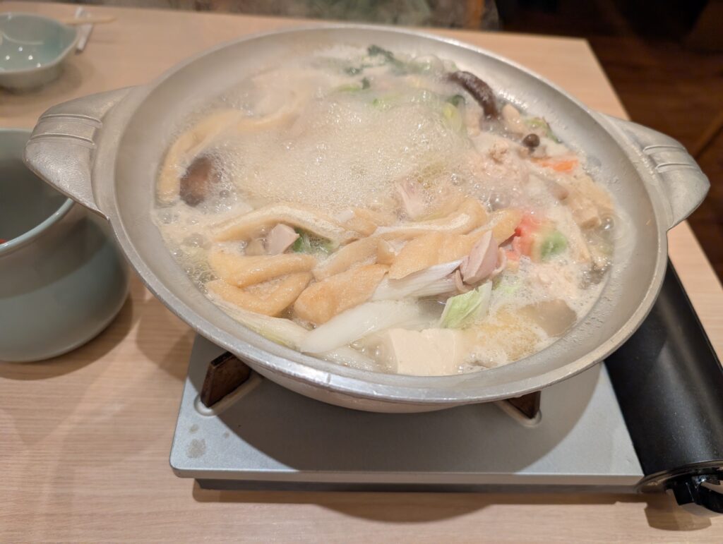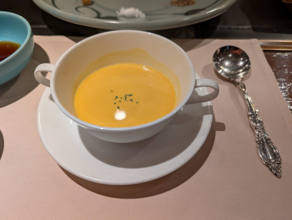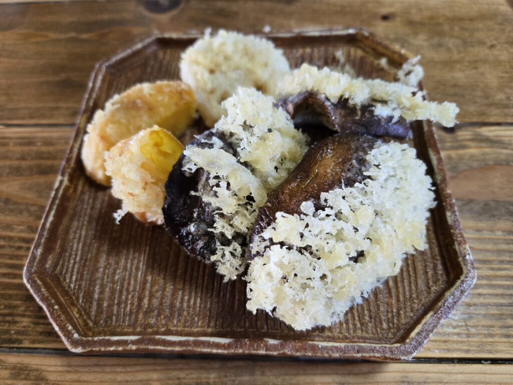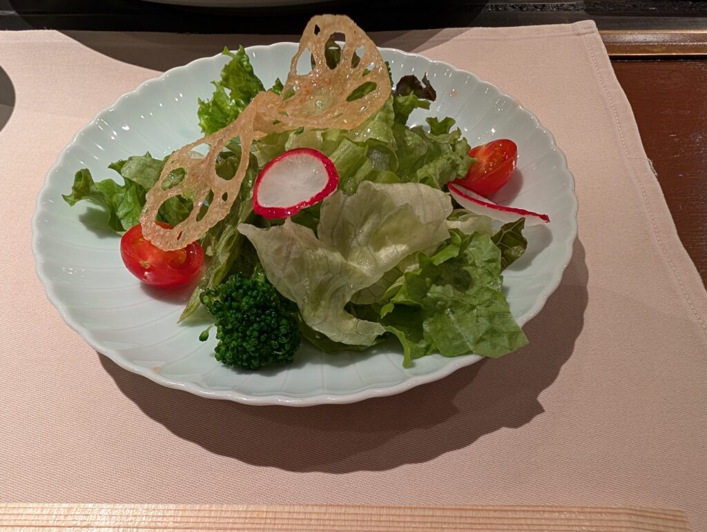 注文をすると直ぐに今日の主役が木のお皿に乗って登場しました、これから頂く前にしっかりと目に焼き付けます、ランチコースはスープとサラダ・デザート付き