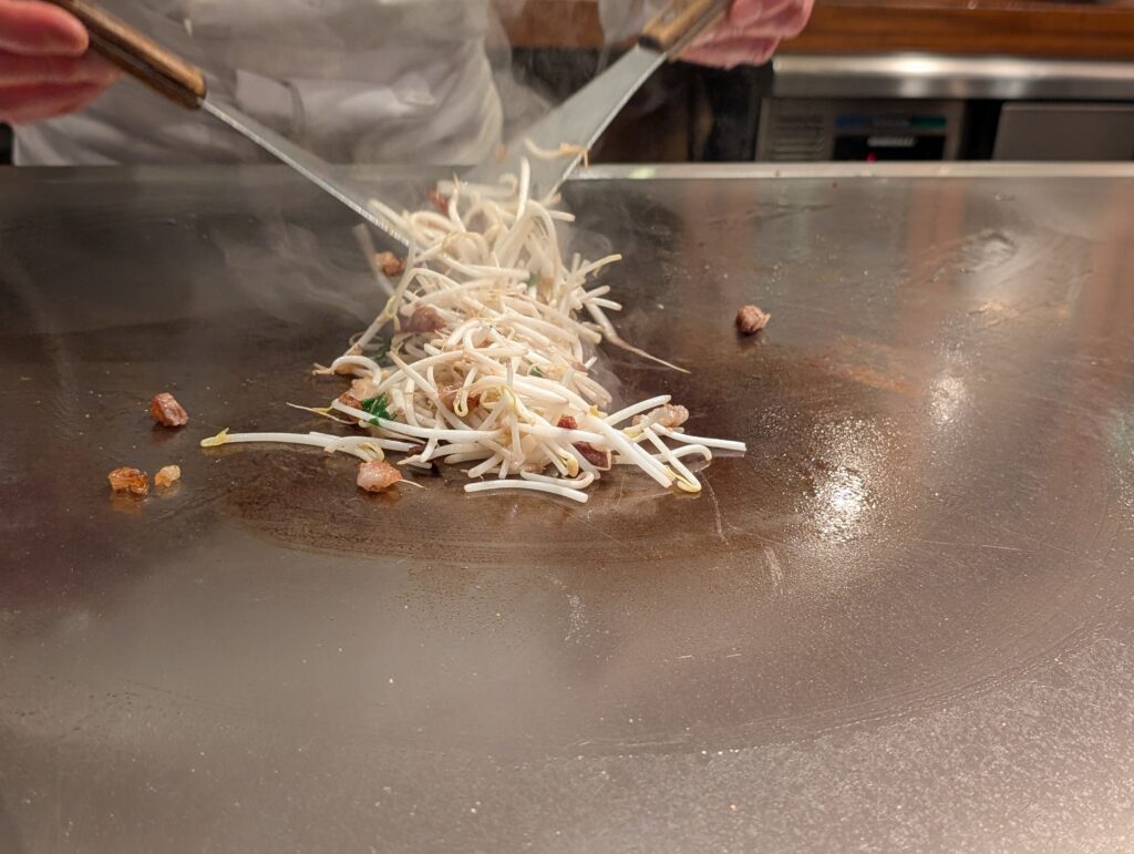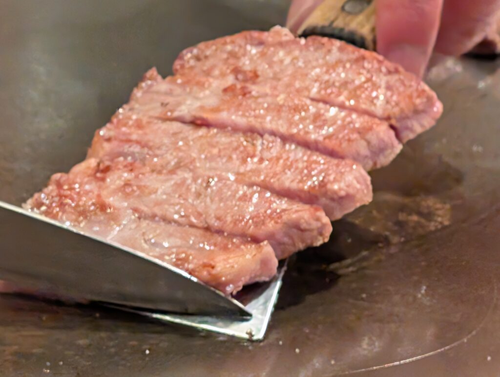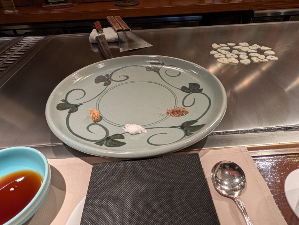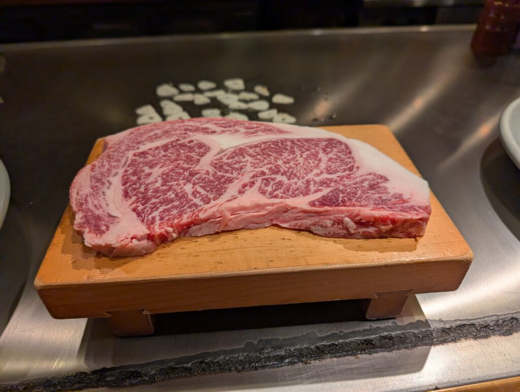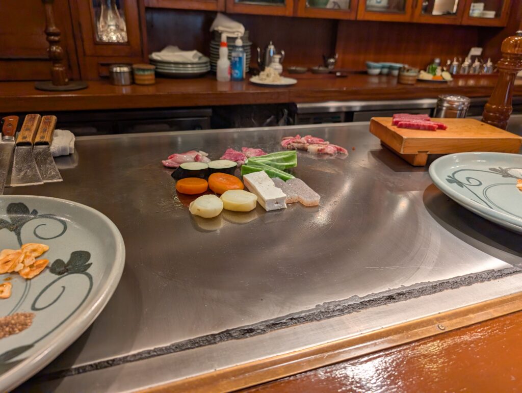 全て目の前で料理をしてもらえるので、お肉の香ばしい香りが漂って待ち遠しいです、絶妙な焼き加減で目の前のお皿へスライディング、このマンツーマンのおもてなしがステーキの醍醐味