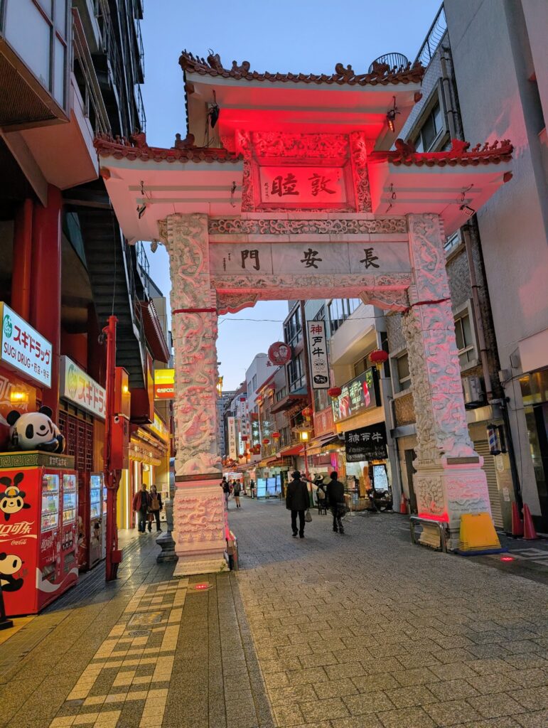 通りの東の入口長安門から散策スタート、南京町のシンボルである長安門は日中両国の平和と友好を願って、貴重な大理石「漢白玉」に約100人の工程師が約1年半かけて、柱に無数の龍と雲の彫刻が施されています