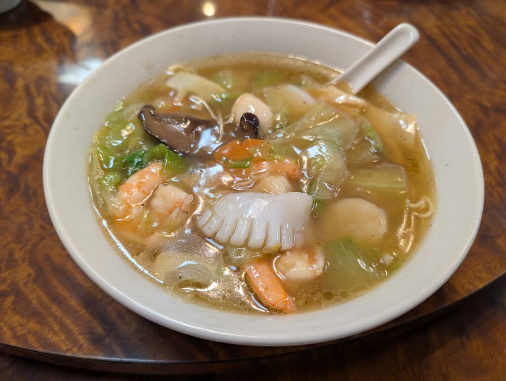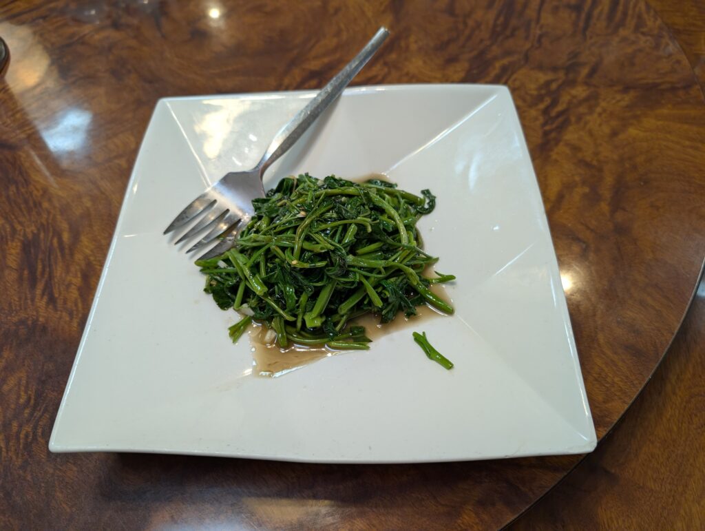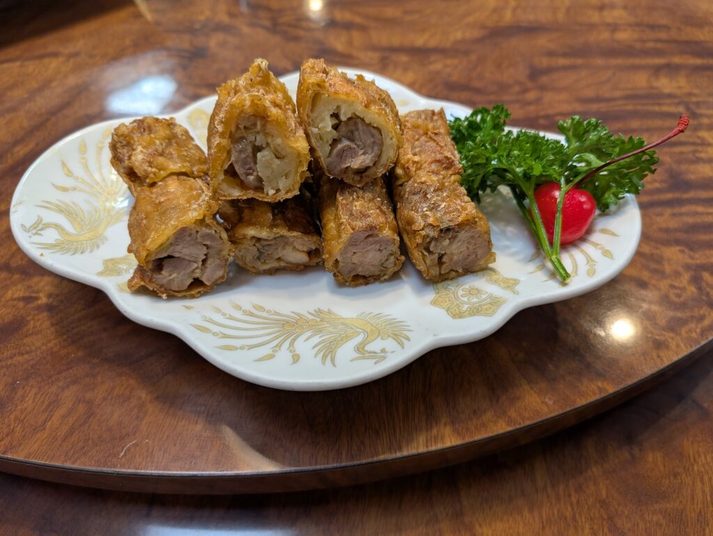 老舗と言っても比較的リーズナブルな点心や定番の中華料理が中心、しっかりディナーでもおつまみとお酒という時でも、幅広いニーズに合わせてくれるお店です、頼んだのは店名物ゆば皮春巻き、空芯菜の炒め物、海鮮スープそば