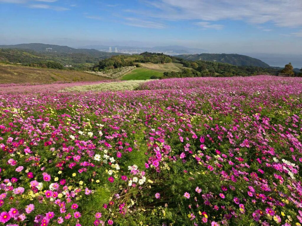 旅の終わりに訪れた淡路島の丘陵地帯に広がる『あわじ花さじき』で、復興を遂げた神戸の街を祝福するように色とりどりの秋桜が風に揺れていました
