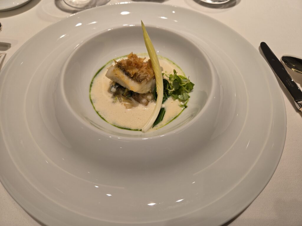 スープの後はいよいよメインの魚料理、甘鯛と白菜と舞茸、魚のうろこを残したまま皮目から高温の油をかけて焼き上げる、日本料理の技法笠松焼の技法を取り入れた一品。うろこが松ぼっくり(笠松)のように見えて、パリッとした食感になることからこの名が付きました。