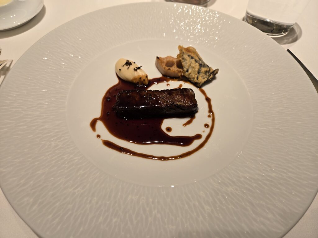 そしてペアリングはメゾン・ブエが提供するボルドーの赤に切り替えて、メインのお肉料理は黒毛和牛のフィレ肉、焼き方は自由に選べます。ミディアムレア派と固くならないギリギリまでよく焼いてもらう派、四人の食事で焼き加減の好みは2対2。