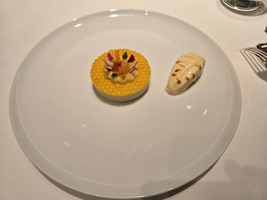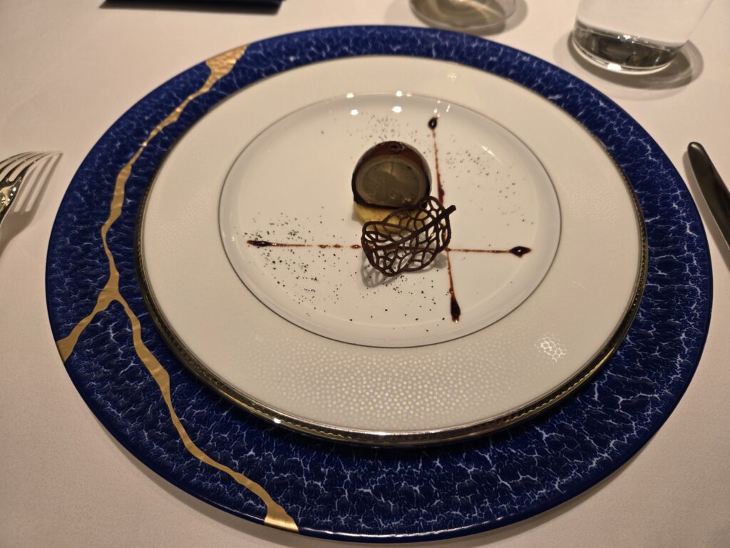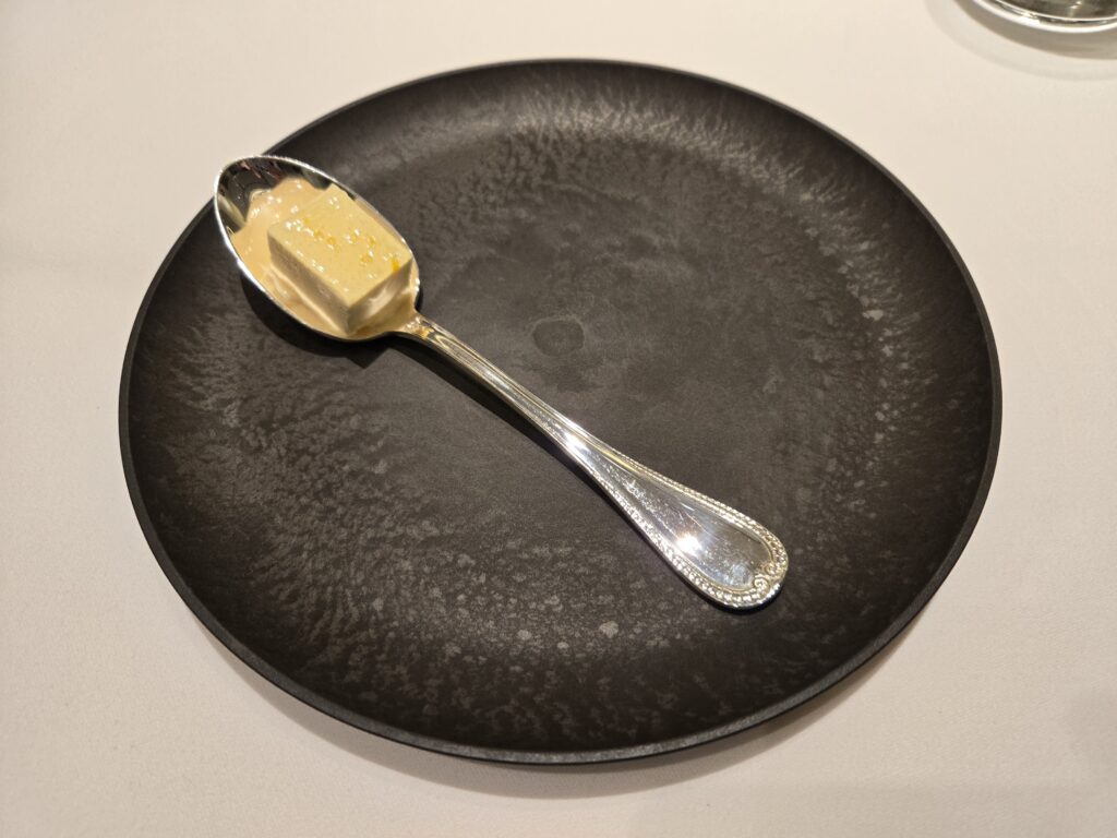 その後はデザート1、スプーンに乗っているのは『へべす』という柑橘系のアイスクリームとジュレ、初めて食べた食材ですが、宮崎県の平兵衛(へいべい)さんが山で香りのよい木酢を見つけて栽培したという経緯から、『平兵衛酢(へべす)』と名付けられたとか。