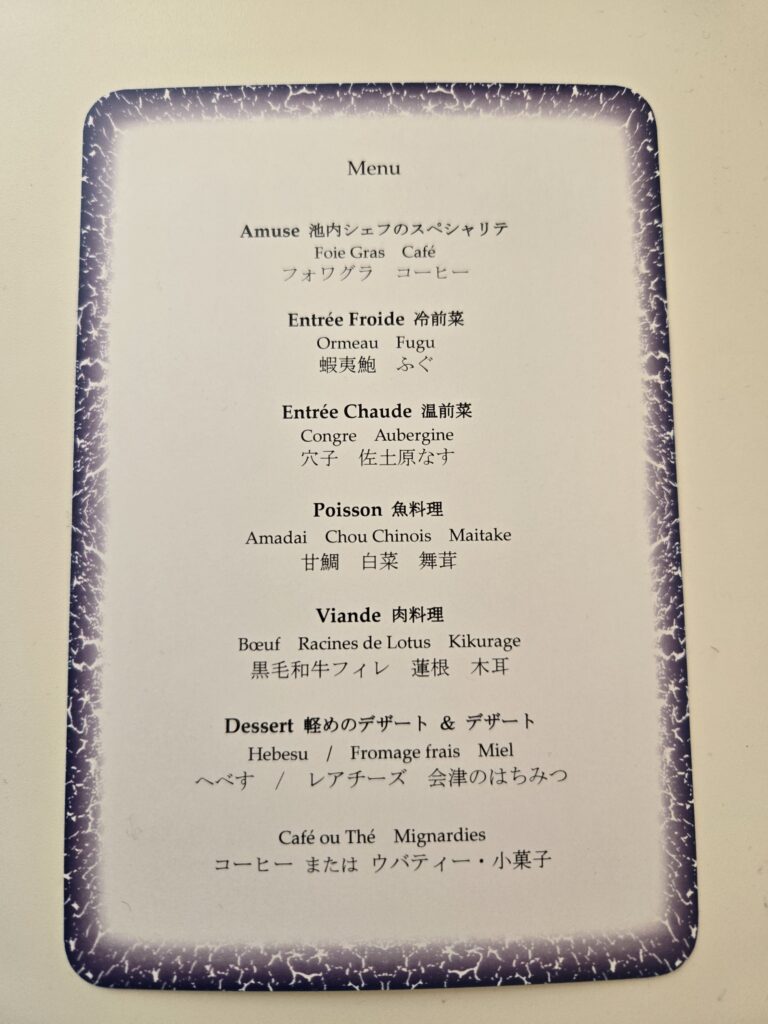 私達も友人夫妻を誘って、早速ディナーに出かけました。池内シェフのお任せメニューは豪華ですが、若い頃と違ってあまりたくさん食べられないので、スモールポーションをお願いしました。