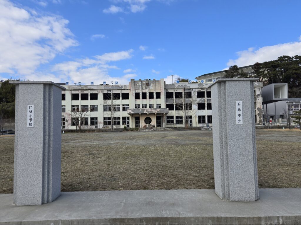 石巻市震災遺構門脇小学校 宮城県石巻市門脇町4-3-15 地震が起きた後、学校にいた児童や教職員たちは裏手にある日和山(ひよりやま)に避難しましたが、地震から約1時間後に巨大津波が襲来し、火災が起こりました。体育館や展示館では、津波で破壊された車両、再現された応急仮設住宅、震災の写真や映像、被災者の言葉や記憶表現(詩・絵)などが展示されていて、津波とそれがもたらす火災について知ることができます。