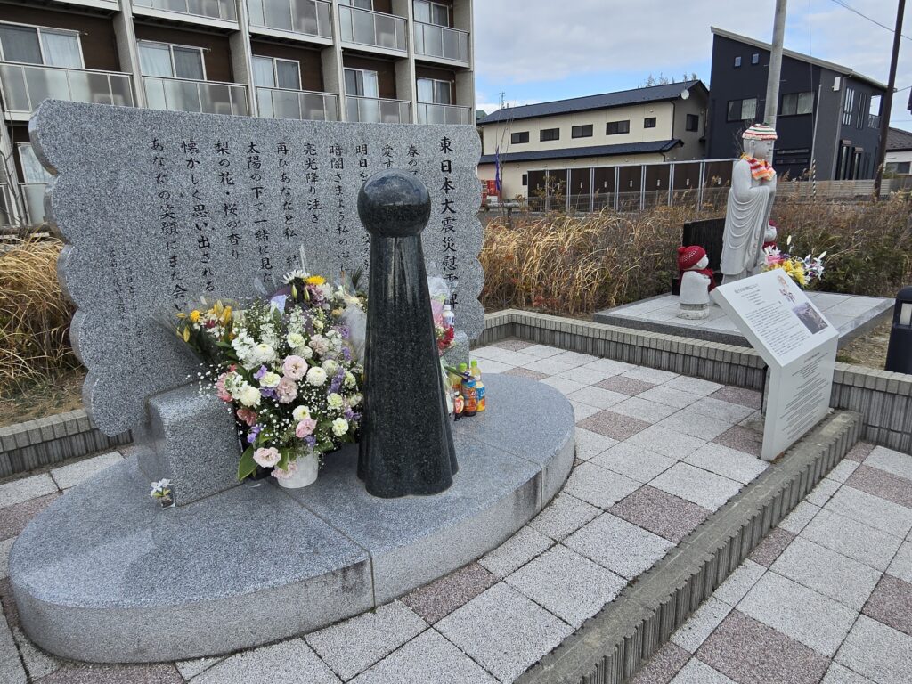 東日本大震災慰霊碑(日和幼稚園被災園児慰霊碑) 宮城県石巻市門脇町5-13-15 日和幼稚園は山の中腹にあり、津波が来る場所ではありませんでした。地震発生時、園内にいた園児たちは全員無事でした。 しかし、揺れが収まった10~15分後、大津波警報が発信されているにもかかわらず、バスは園児を乗せ出発し、園児を保護者に引き渡そうと海沿いの街を走っていて津波に遭い、園児5人が犠牲になりました。