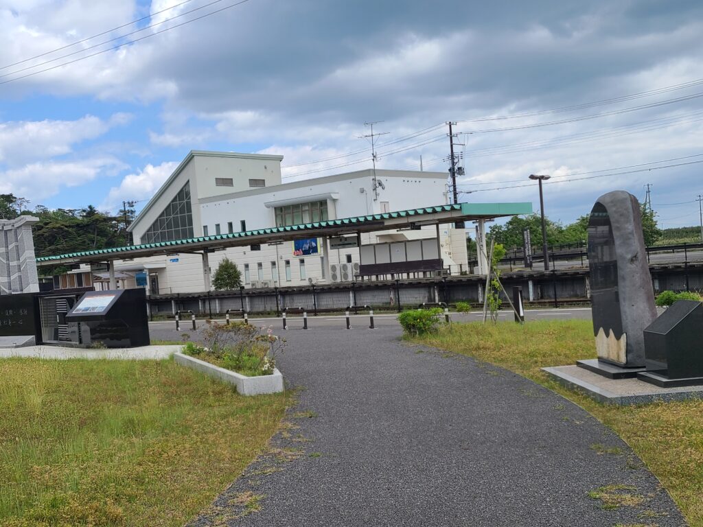 東松島市東日本大震災復興祈念公園 東松島市震災復興伝承館 宮城県東松島市野蒜字北余景56-36(旧JR野蒜駅) 仙石線野蒜(のびる)駅で上りと下りの列車がほぼ同時に発車してすぐ、激しい地震が襲ってきました。非常停車した上り列車の乗務員は、直ちに梯子で乗客を降ろし、指定避難場所である野蒜小学校へ誘導しました。人のいなくなった駅舎も上り列車も、その後に襲った津波に飲み込まれ、大きく破壊されました。一方、下り列車の停車した場所は野蒜小学校まで距離があるため、そこまで歩いて行くのが危険であり、列車が止まったのがやや高い位置だったので、列車内に留まると判断しました。周囲は津波で水浸しになりましたが、幸いにも列車まで水が到達することはありませんでした。全員が列車内で一夜を過ごし、翌日、避難所に退避しました。 震災後、野蒜駅を含めて仙石線の線路は高台に付け替えられ、旧駅舎が保存されて東松島市震災復興伝承館となり、また付近は東松島市東日本大震災復興祈念公園として整備されました。
