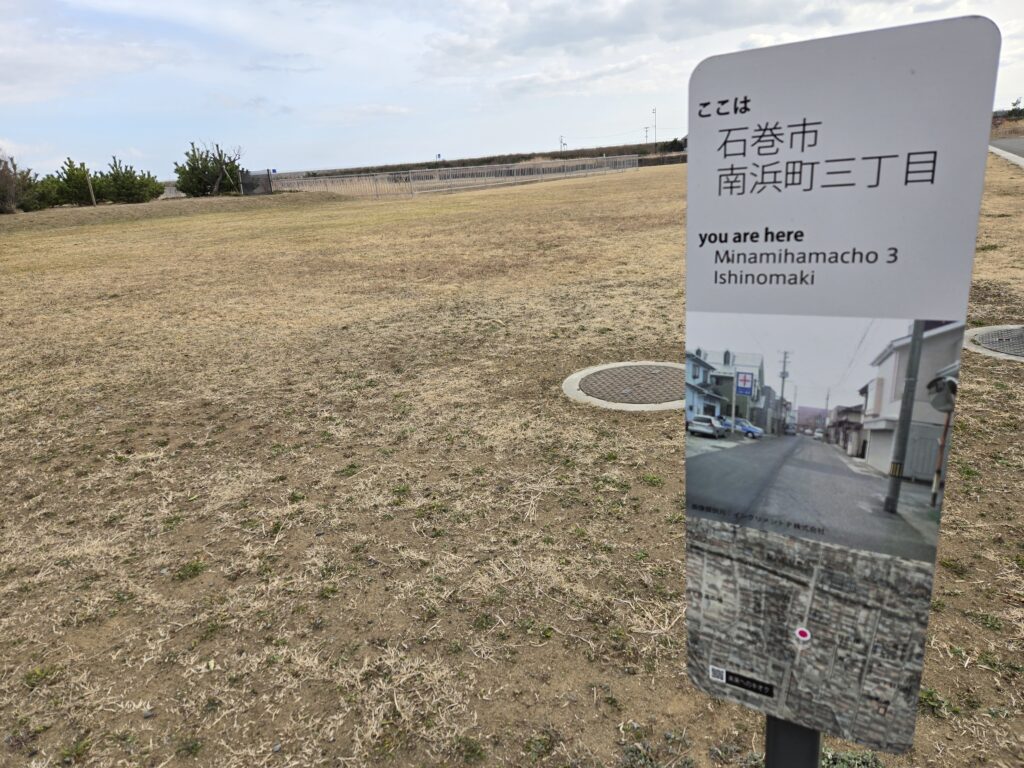 石巻南浜津波復興祈念公園。震災前の街並みの写真も表示されている