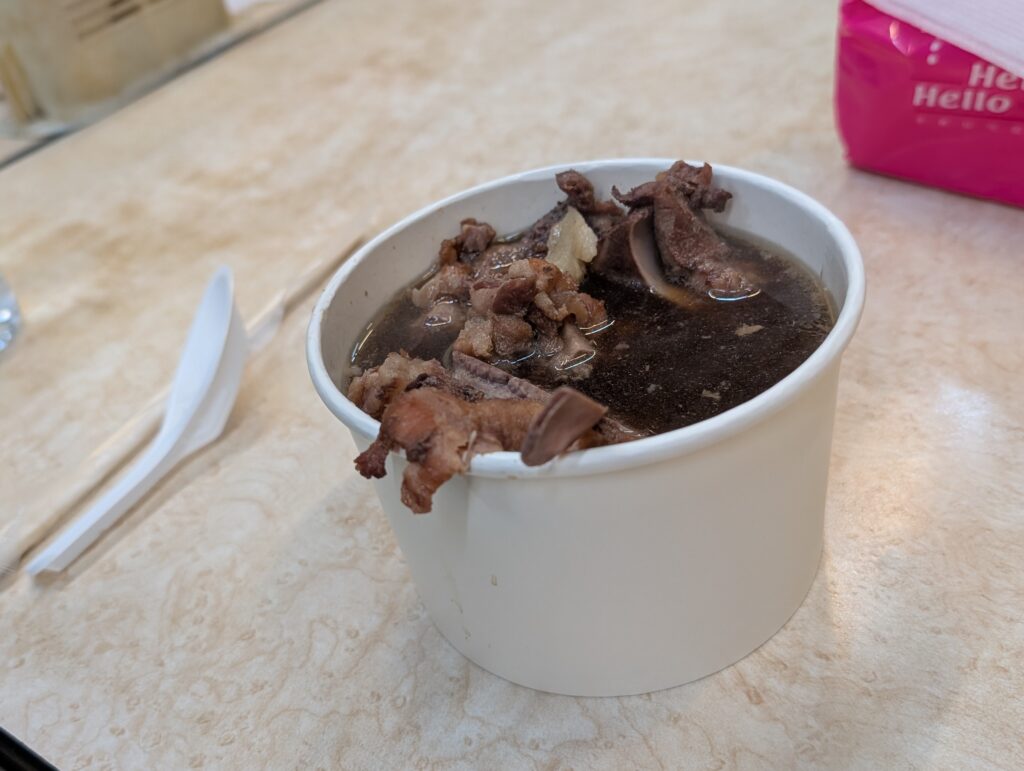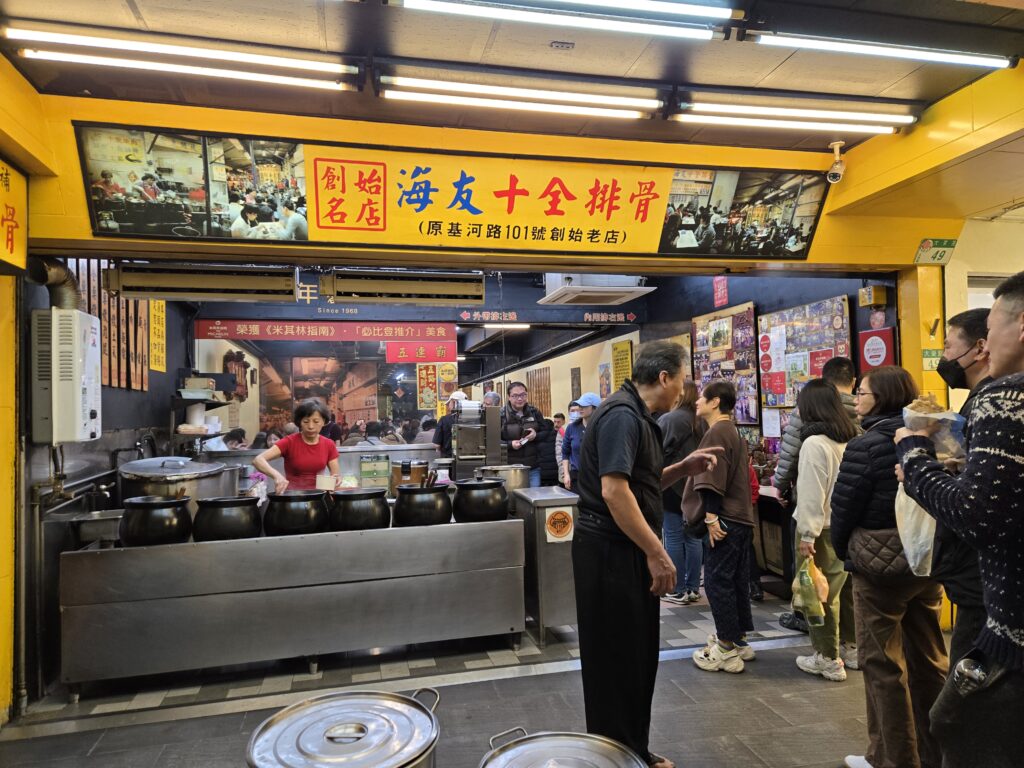 まず行ってみたのは『るるぶ台湾』に載っていた、地元の名店『海友十全排骨』、15種類の漢方薬と牛骨を10時間以上煮込んだスープが有名、地元の人たちはご家族やカップルで麺等と一緒に夕食代わりに楽しんでいる様子、いろいろ食べ歩きたいので私たちはスープだけとても窮屈な相席で頂きました
