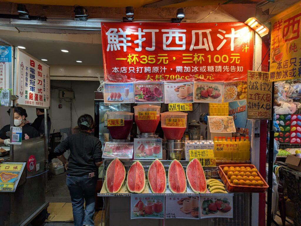下記のジュース屋台の看板をGoogle翻訳にお願いしたら、新鮮なスイカジュース・カップ1杯35元(約175円)、カップ3杯100元(約500円)との翻訳、3つ並んだ大きなジュース撹拌機、向かって左端の翻訳してくれなかった火龍果というフルーツは、たぶんドラゴンフルーツの事かなと、そちらも100%果汁で販売されているのがいかにも亜熱帯の国らしい