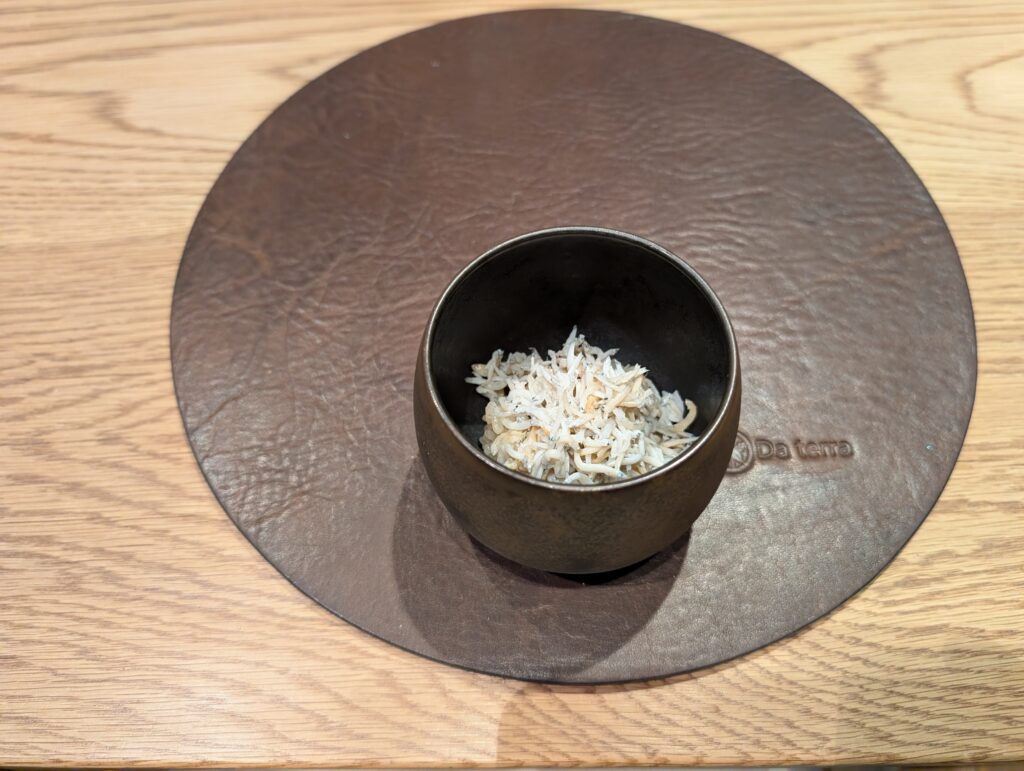 油物はうすい豆のかき揚げ・稚鮎の薄衣、グリーンピースを改良した春から夏にかけてが旬なうすい豆はホクホクの食感、このかき揚げは山椒塩で、稚鮎は一般的な蓼ではなく木の芽酢で頂きます、全て春らしい素材がより美味しくなるように、香辛料や調味料のチョイスが素晴らしい
